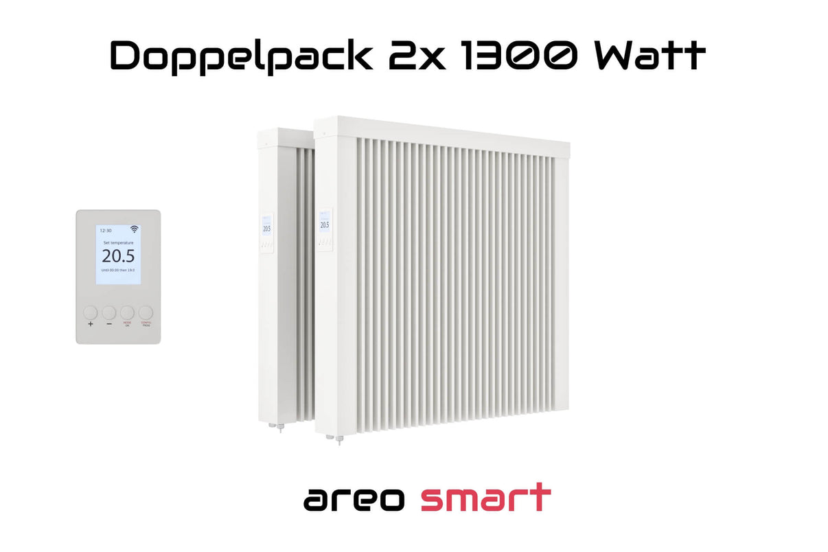 Sichere dir bis zu 12 % Rabatt auf die Areo Smart 1300 W Flächenspeicherheizung Paketsets. Ideal für mehrere Räume: Doppelpack 7 %, Dreierpack 10 %, Vierer- oder Fünferpack 12 % Rabatt.